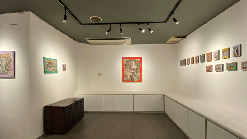 Icons of memoryと題した本展は、金丸悠児の布や英字新聞をパッチワークのように貼り合わせた、コラージュシリーズの新たな試みとなります。
