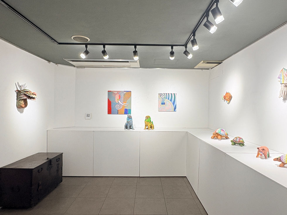 本展「ホシノカタチ」では、絵画制作で培われた色彩感覚を立体表現へと取り入れ、金丸が考える「生命の形」を表現します。 獅子(狛犬)、ブタ、カメ、アルマジロ、龍頭、タコ、イカ、カレイなど、多様な生き物をモチーフとした作品を約20点展覧いたします。